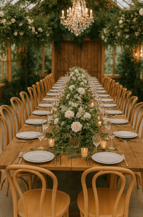 En complément, les tables rectangulaires structurent l’espace et facilitent l’organisation du dîner. La table pliante bois rustique Héritage est particulièrement adaptée aux tables d’honneur, buffets ou espaces traiteur, tout en conservant une cohérence esthétique avec l’ensemble de la scénographie.