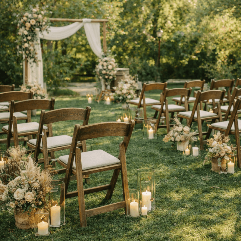 Demandez un devisInspirée des réceptions élégantes et des mariages champêtres, la chaise pliante WEDDING effet bois foncé rustique apporte une touche authentique et chaleureuse aux cérémonies, cocktails et banquets. Son rendu bois rustique s’intègre parfaitement dans des scénographies bohèmes chic, vintage ou en plein air.