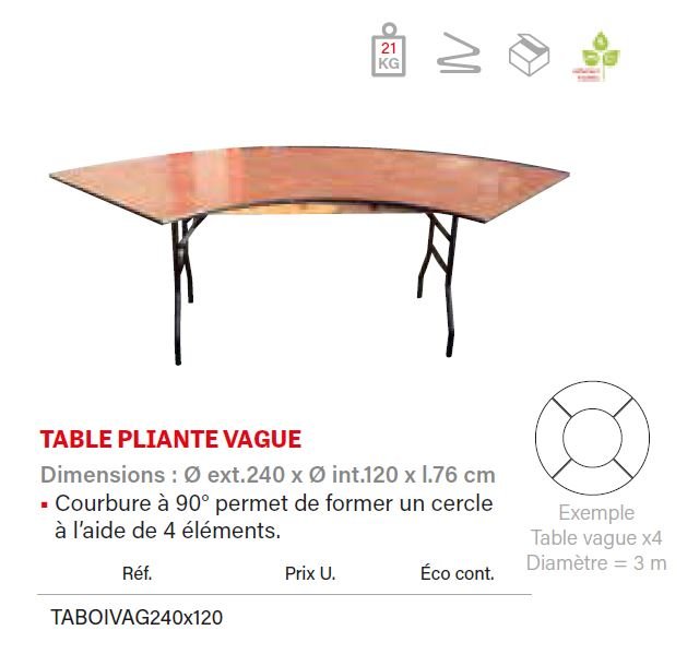 Demandez un devisLa table pliante vague 240 cm est la solution idéale pour créer une scénographie élégante et moderne lors de vos événements. Sa forme incurvée à 90°, très tendance pour les mariages actuels, permet de composer des espaces raffinés et originaux.